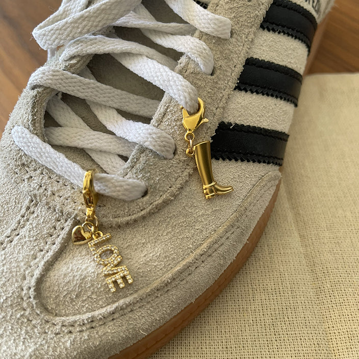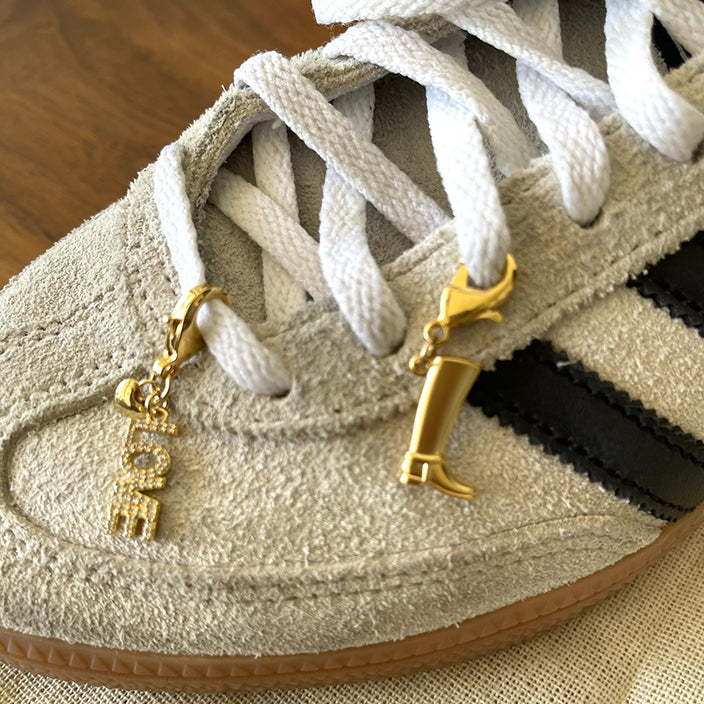 Easy to put on any shoe or sneaker with laces, the charms hang on a lobster clasp so you can move the charm anywhere on the shoe to personalize your look and easily move from shoe to shoe.