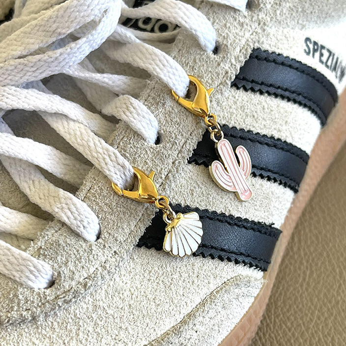 Easy to put on any shoe or sneaker with laces, the charms hang on a lobster clasp so you can move the charm anywhere on the shoe to personalize your look and easily move from shoe to shoe.